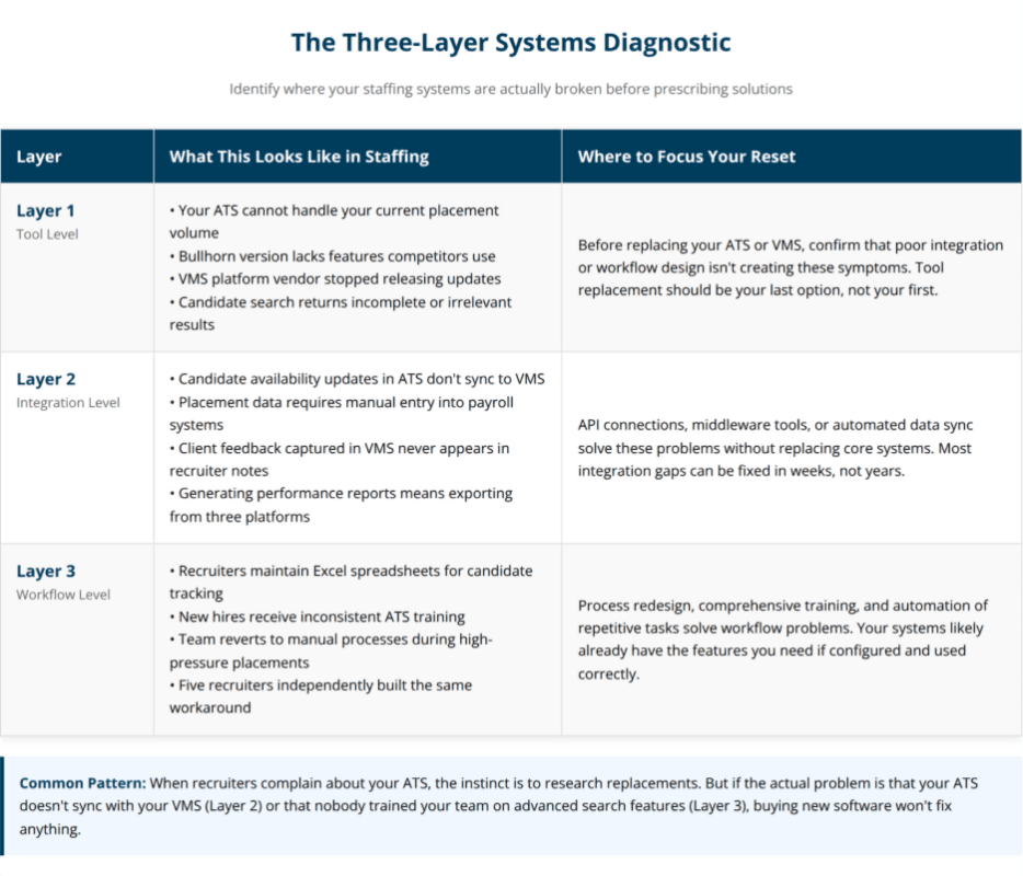 When recruiters complain about the ATS, operations teams start researching alternatives. When reports require manual data reconciliation, leadership considers platform migrations. A staffing systems reset means optimization, not replacement, fixing how systems work together and how people use them, not abandoning core platforms.