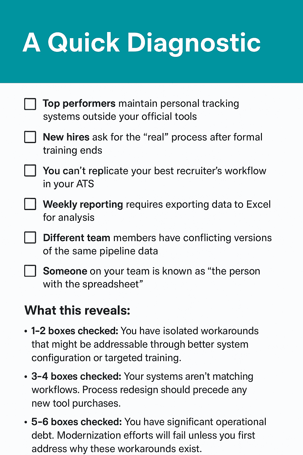 These workarounds aren’t signs of poor training or resistance to technology. They’re signals that your systems don’t align with how recruiting work flows. The question isn’t whether you have the right tools, but whether those tools support the way your team operates or create friction that makes manual processes feel more efficient.