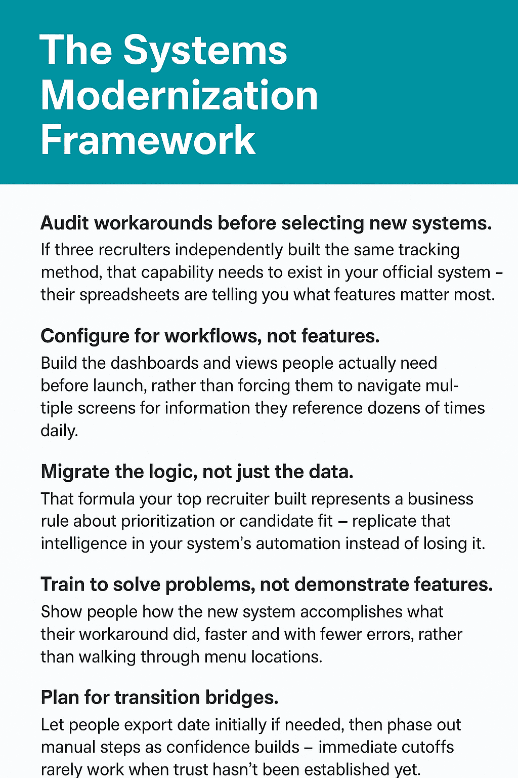 When someone rebuilds a workaround after launch, that signals a system gap requiring attention rather than a training failure. Establish regular check-ins during the first 90 days specifically to surface where the new system isn’t meeting workflow needs. Early course corrections prevent temporary workarounds from becoming permanent shadow processes that undermine your modernization investment.