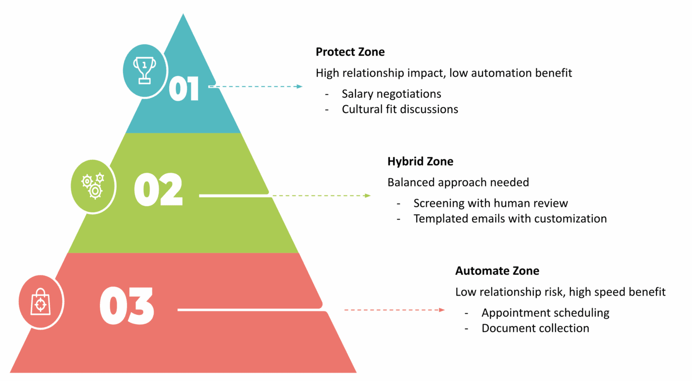 Hybrid Zone: Processes that need an automation backbone with human oversight – candidate screening with recruiter review, automated job matching with personalized explanations, and templated communications that recruiters can customize before sending.